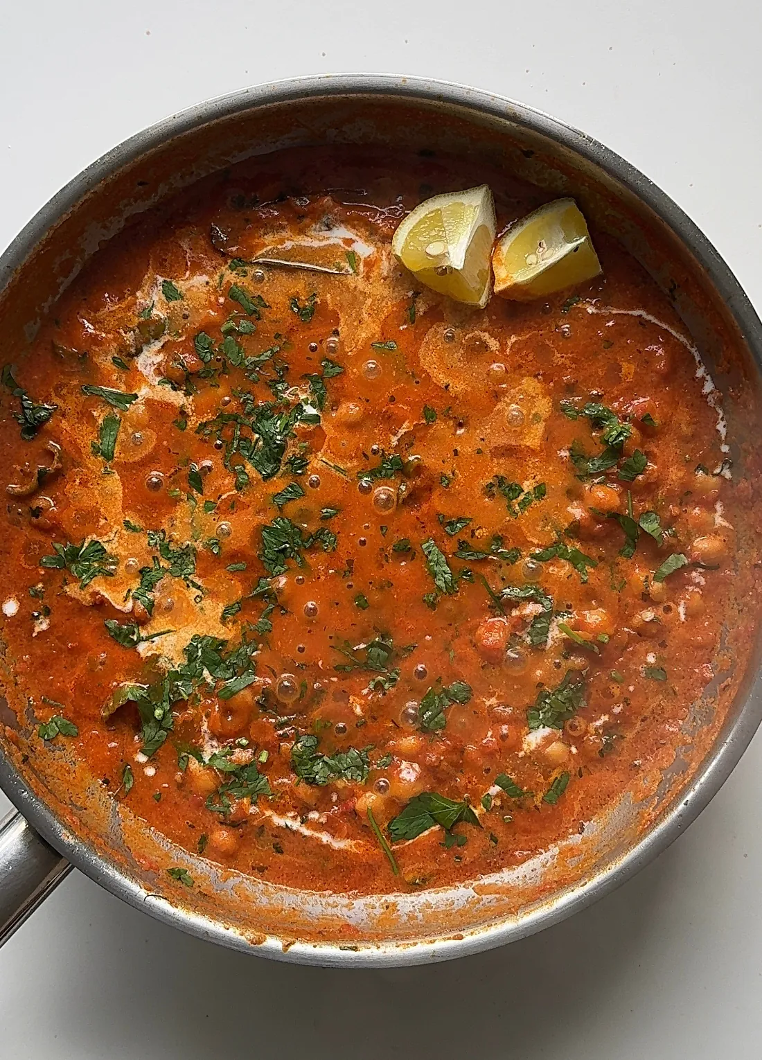 - Stir in chickpeas, water, and coriander. Cover and cook 5–7 mins.
