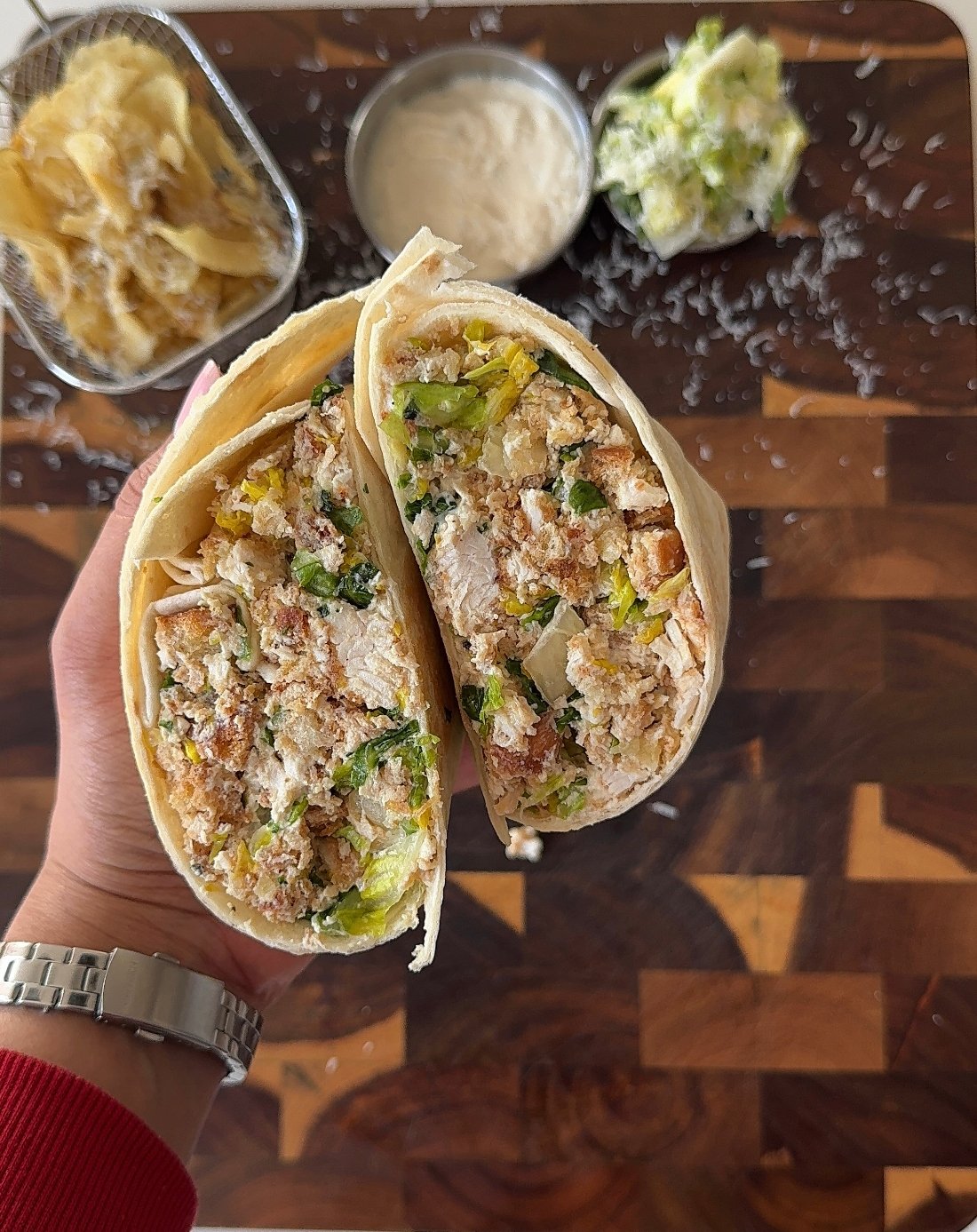 Serve immediately while the chicken is still crispy. You can also slice the wraps in half and serve with extra Caesar dressing on the side.