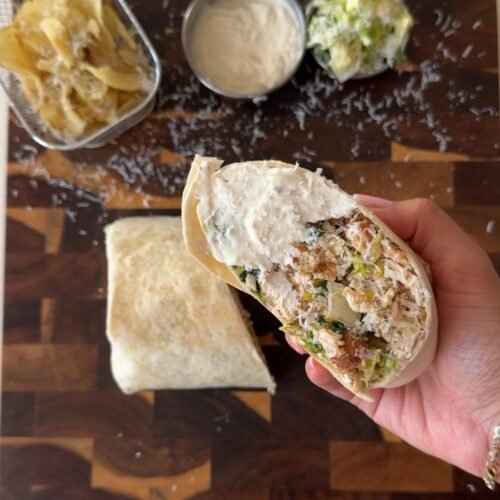 Golden chicken cutlets are coated until crisp, then roughly chopped and mixed with Caesar-dressed lettuce, extra dressing, croutons, and salt and vinegar chips before being wrapped up in a soft tortilla. It is fresh, crispy, satisfying, and so easy to recreate at home.