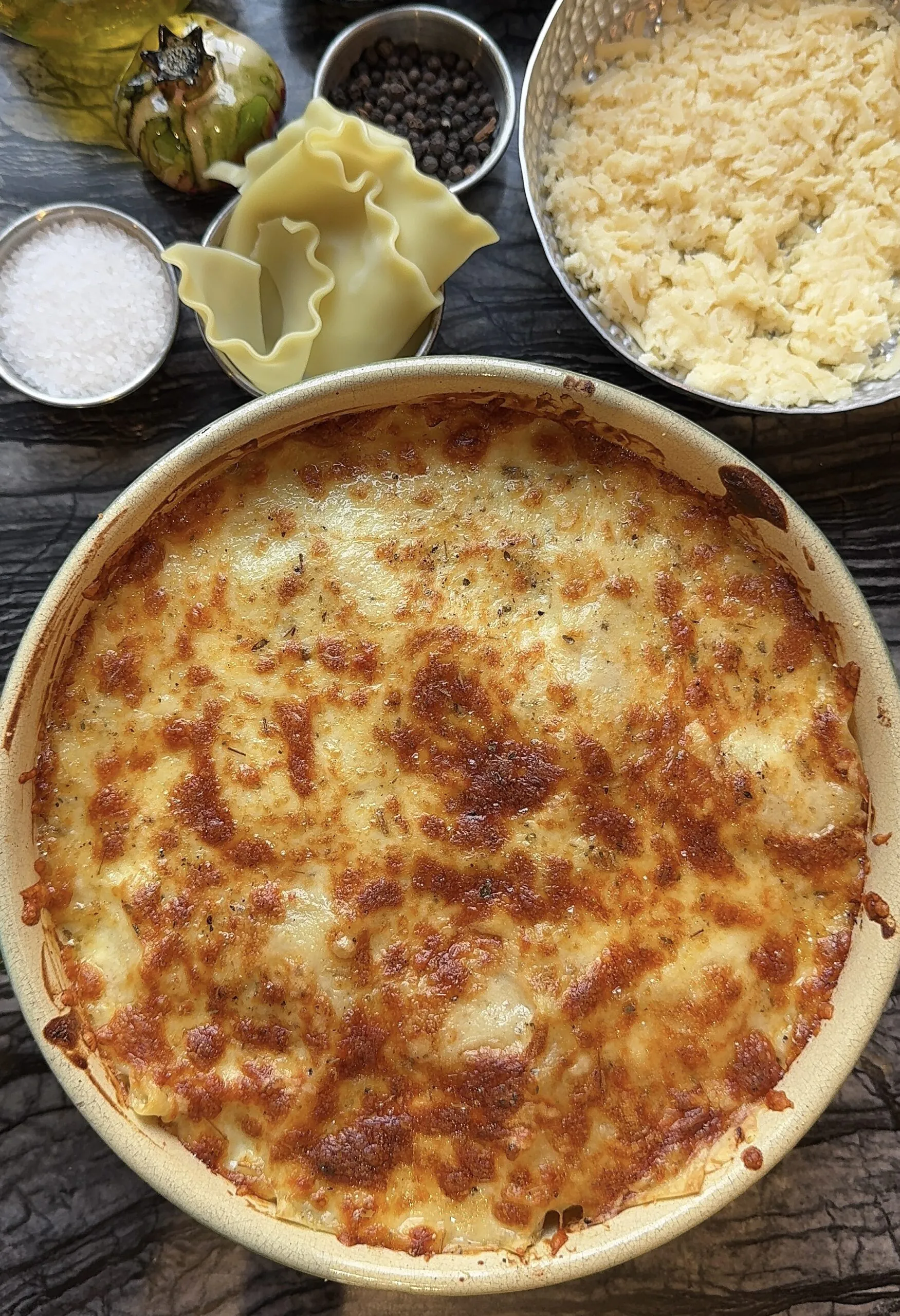 - For the final layer, add lasagna strips, top with a generous amount of white sauce, cheddar cheese, and finish with mozzarella.