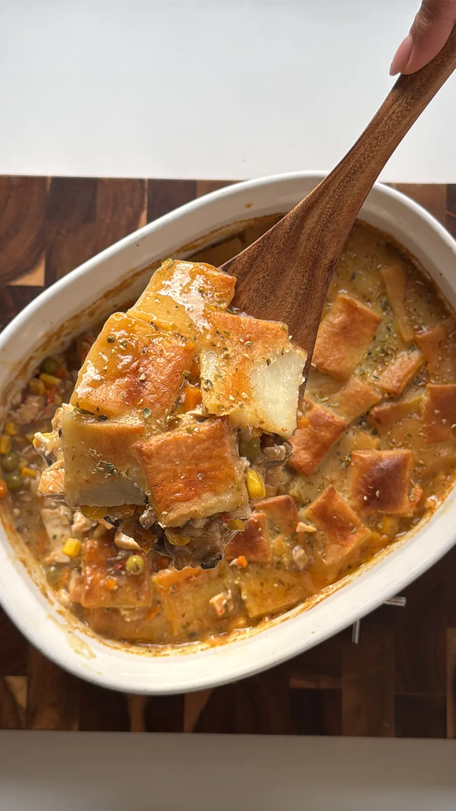 Comfort in a dish: Creamy chicken filling with tender veggies tucked under golden puff pastry.
