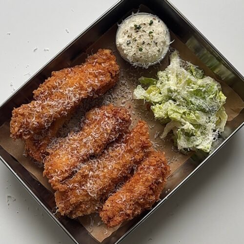 These crispy chicken caesar tenders are crispy, juicy served with creamy caesar dressing and a fresh, crunchy salad. This recipe brings together everything you love about a classic caesar salad, but in a heartier, more satisfying way. The chicken is seasoned with paprika, garlic, and white pepper, coated in parmesan panko crumbs for that irresistible crunch, and paired with a homemade caesar dressing that’s creamy, tangy, and full of flavor.