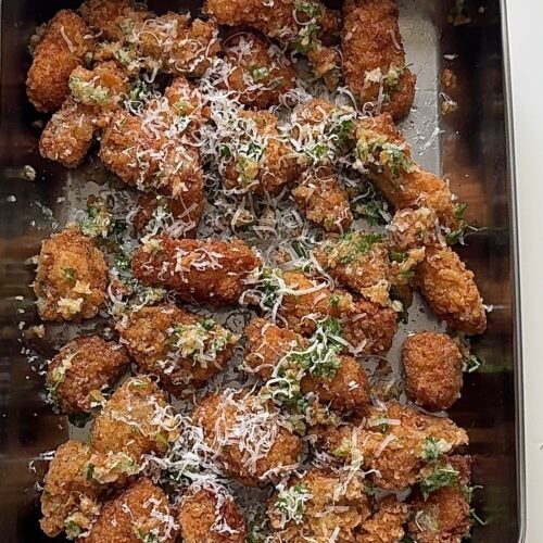 This Crispy Garlic Parmesan Chicken is the perfect snack or quick dinner. Golden fried chicken bites tossed in buttery garlic and parmesan make a crowd-pleasing dish that’s easy to prepare and ready in under 30 minutes.