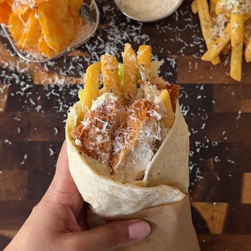 These Crispy Garlic Parmesan Chicken Wraps are crunchy, creamy, and packed with flavor. Golden chicken cutlets are coated in a crispy parmesan breadcrumb mixture, then wrapped up with chopped romaine, garlic mayonnaise, and a generous sprinkle of parmesan. Add garlic parmesan fries inside and you have the ultimate wrap that is filling, crispy, and so satisfying.