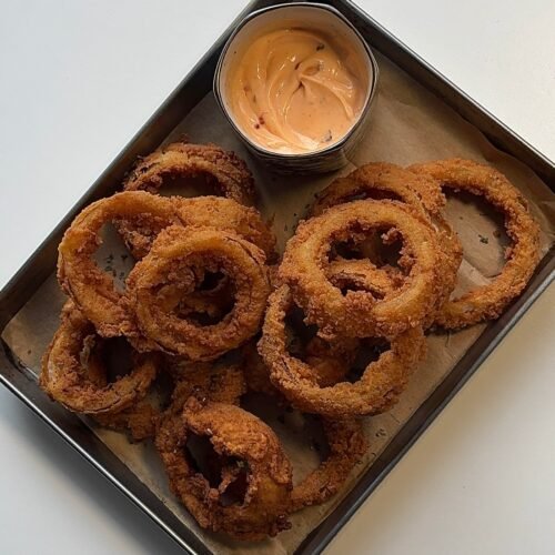 Golden, crunchy, and perfectly seasoned, these crispy onion rings are everything you want in a classic snack or side. They have a light batter on the inside, an extra-crispy breadcrumb coating on the outside, and fry up beautifully crunchy every single time. Serve them with the quick sweet chilli mayo dip, and they’re guaranteed to disappear fast.