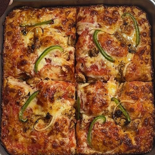 This Deep Pan Chicken Tikka Pizza is inspired by Detroit-style pizza—tall edges, a fluffy but crisp crust, and a generous layer of cheese that caramelises beautifully against the sides of the pan. The flavours are nostalgic and familiar, just like the classic Chicken Tikka Pizza from Pizza Hut that so many of us grew up eating. The dough is simple, forgiving, and perfect for beginners, and the pizza can be baked in either a square deep-pan tin or a standard sheet pan.