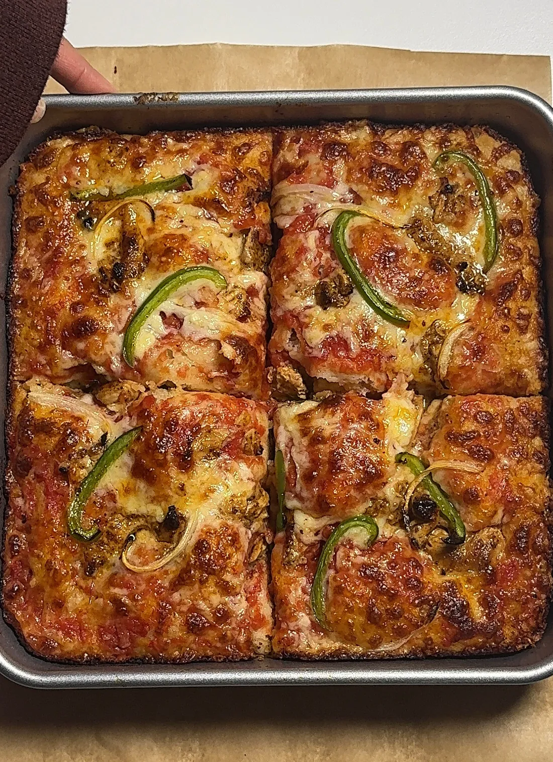 A square or rectangular deep-pan works best (similar to Detroit style).