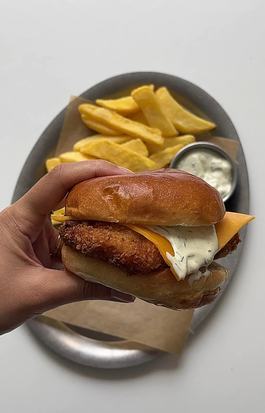- Top with a crispy fish fillet.