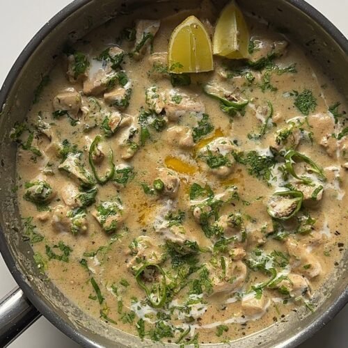 This dish is a twist on classic handi recipes — juicy chicken cubes marinated in a silky mix of yogurt, cream, and spices, then simmered in a rich gravy with cheese and kasuri methi for that restaurant-style flavor at home. And yes, we’re even finishing it off with the signature smoky coal dum for that irresistible aroma! Perfect with chapati, naan, or even plain basmati rice when you’re craving comfort food without the fuss.