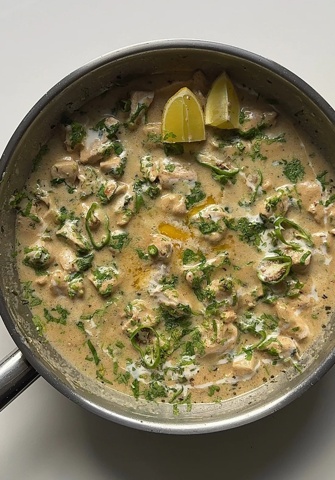 - Remove the cover and add more cream, chopped green chillies, and kasuri methi.