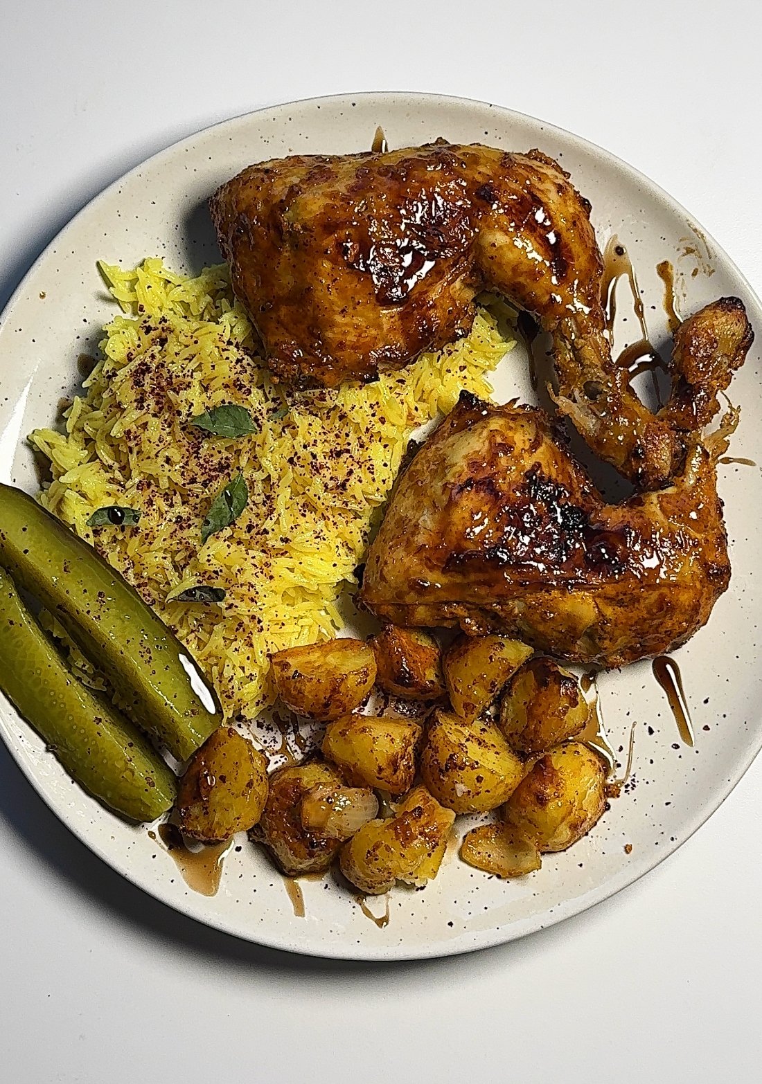 This stunning Persian inspired chicken and turmeric rice brings together juicy, marinated chicken, golden turmeric basmati rice, and a tangy sumac salad for the ultimate family-style dinner. It’s fragrant, colorful, and rich with spice perfect for a weekend dinner, a summer gathering, or even Eid when there’s plenty of meat to use up. The layers of flavor and texture make it unforgettable.