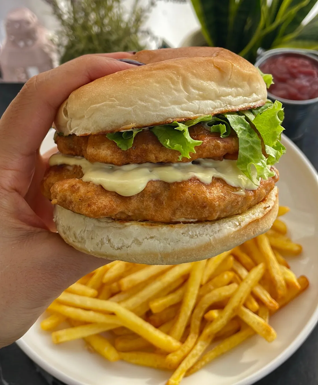- Close the burger and enjoy fresh with fries and ketchup!
