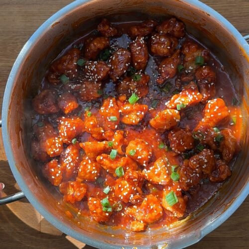 Crispy fried chicken bites tossed in a sticky, sweet, and spicy Korean-style sauce made with garlic, gochujang, soy sauce, and ketchup. Finished with sesame seeds and spring onions for the perfect homemade fried chicken recipe.