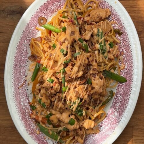 In a serving dish, layer rice, sauce, chow mein noodles, chicken, more sauce, fried garlic, green onions, and more sauce.